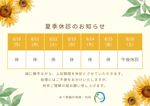 8月10日から8月15日まで休診となります。